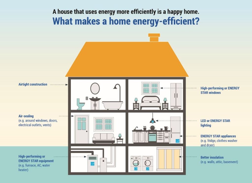 Operational Efficiency Airtight construction with and better insulation (e.g. walls, attic, basement) , high-performing ENERGY STAR certified windows, LED or ENERGY STAR certified lighting, ENERGY STAR certified appliances (e.g. fridge, clothes washer and dryer) & Equipment (e.g. furnace, AC, water heater)